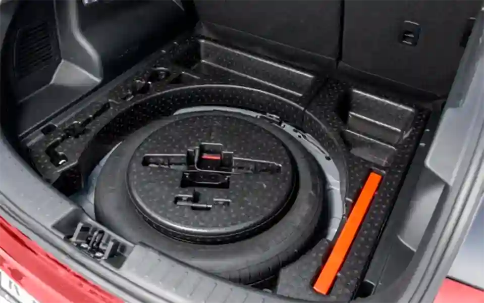 Средний ряд поделен на сдвижные части. Если найти компромисс трансформации, на галерке упаковываешься беспроблемно. Багаж, разумеется, не сдаем — ибо некуда, за третьим рядом остается минимум площади. Полноценную запаску выдворили под кузов.
